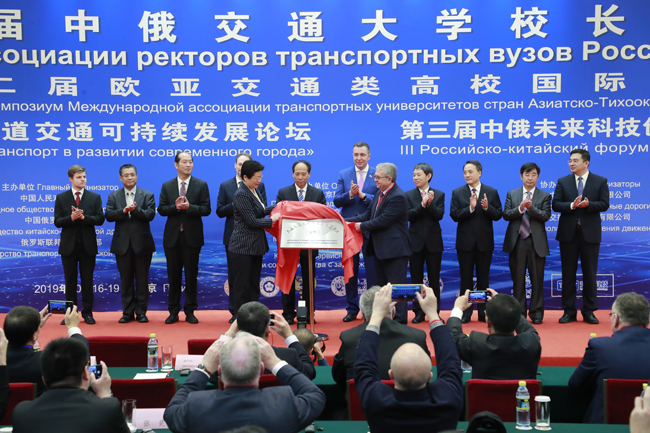 大连交通大学远交大交通学院揭牌仪式在人民大会堂举行。全国人大常委会副委员长吉炳轩,俄联邦政府特使、俄联邦国家科技知识创新委员会主席斯塔洛沃伊托夫,中国人民对外友好协会副会长户思社等领导出席了揭牌仪式。党委书记阙澄宇、俄罗斯远东国立交通大学校长达维多夫·尤里·安纳托利耶维奇共同为“大连交通大学远交大交通学院”揭牌。 |
